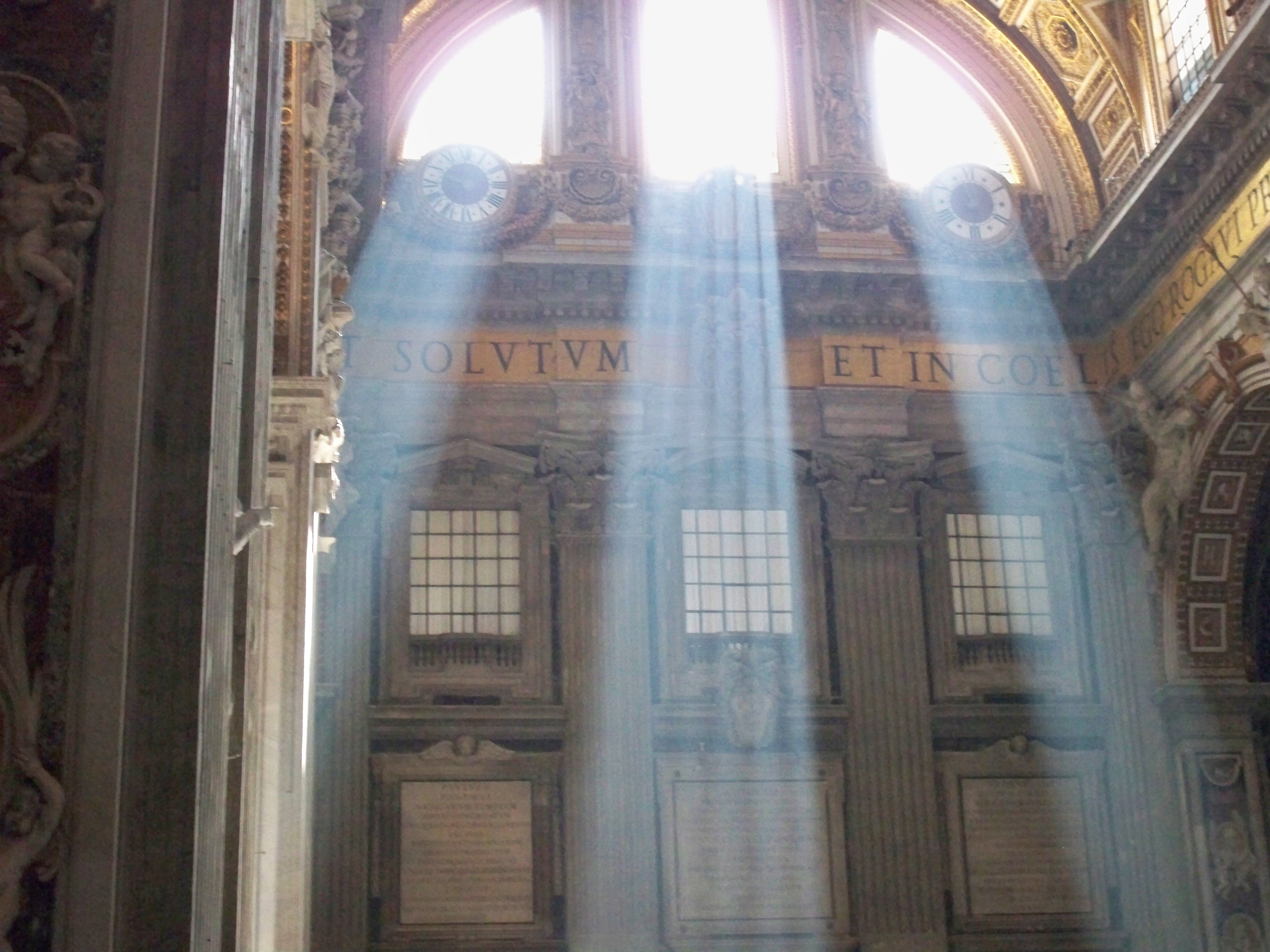 I took this picture at St. Peter’s Basilica in 2010. At the time, I found the sunlight streaming in through the windows quite moving. It called to mind certain verses in the gospel of John. “The man who walks in the dark does not know where he is going.” “I have come into the world as a light, so that no one who believes in me should stay in darkness,” “Put your trust in the light…so that you may become sons of the light.” Emily Dickinson wrote a famous poem about light streaming down from the clouds. Unfortunately, all I remember about the poem is a college professor spending half an hour breaking down the structure of that poem and the use of crepuscular rays as meaningful imagery. In case you didn’t know, crepuscular rays just means ‘sunbeams.’ So why not just say sun beams? Sometimes, in examining the details of something, whether it be a poem or the Bible, we can lose the simple and beautiful meaning of what is being said. Today, the picture speaks more to me of hope. We live in a dark world, but God’s light penetrates the dark. God illuminates the dark. Jesus came into the world as the light of the world. There is hope and salvation through him. So when you see those crepuscular rays shining, let them be a reminder of Jesus Christ, the hope of the world.